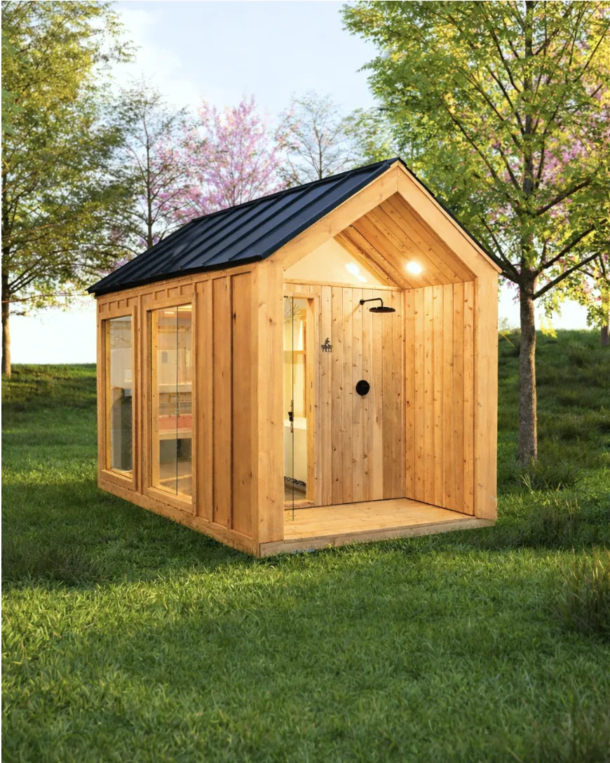 Metal siding, Bluetooth speaker system, Hinge door with keypad, and cedar ceiling
